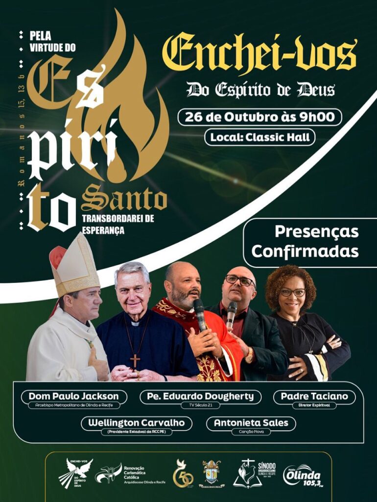 A Renovação Carismática Católica (RCC) promove no próximo dia 26 de outubro de 2025 o 38º “Enchei-vos do Espírito de Deus” e a comemoração do Jubileu de Ouro dos 50 anos da RCC na Arquidiocese de Olinda e Recife. O evento acontece das 9h às 19h no Classic Hall, trazendo como tema: “Pela virtude do Espírito Santo, transbordarei de Esperança” (Romanos 15,15b).